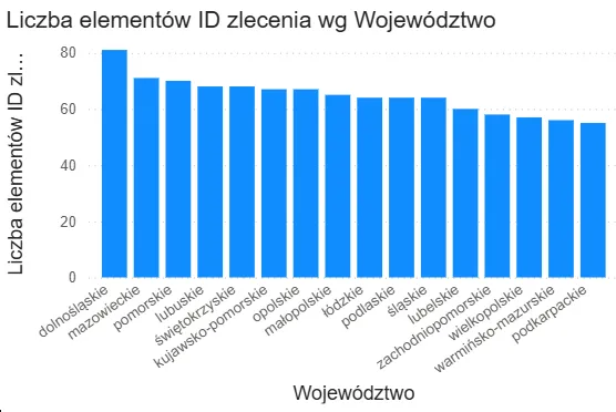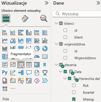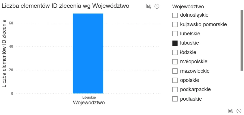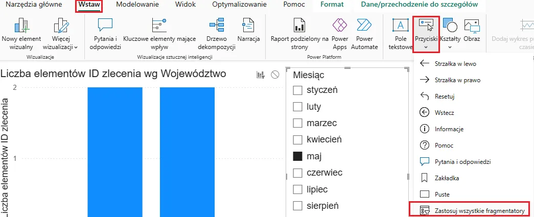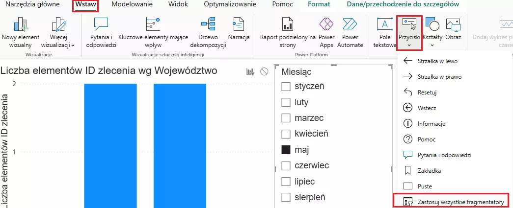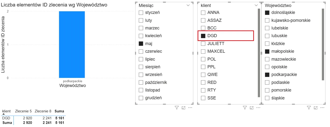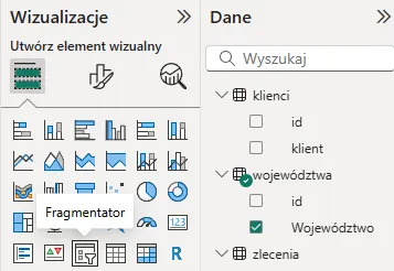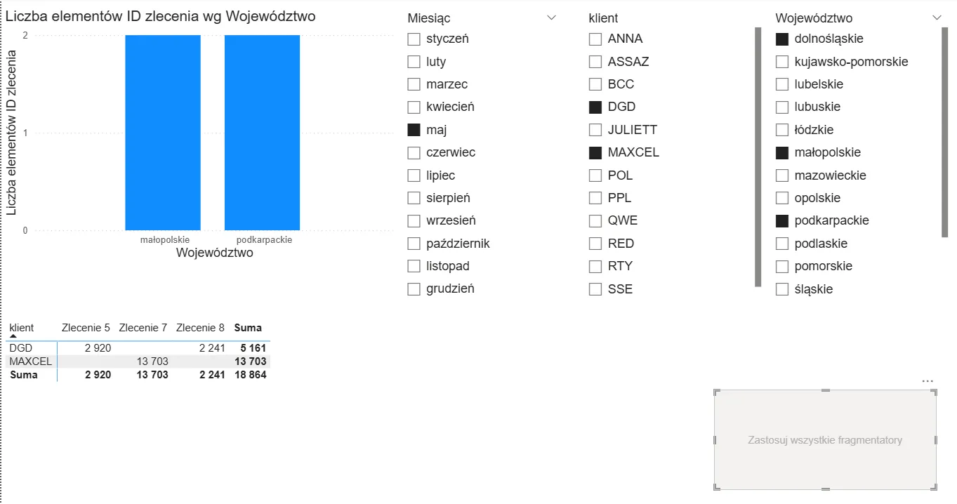 Na przykład, gdy rozliczamy liczbę zleceń w każdym województwie, wybór województwa we fragmentatorze (np. łódzkie) spowoduje, że wykres przedstawi tylko jeden punkt danych – co może być niepożądanym efektem, bo nie pokażemy pełnego porównania wartości.