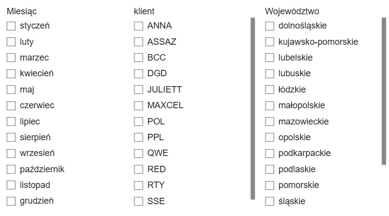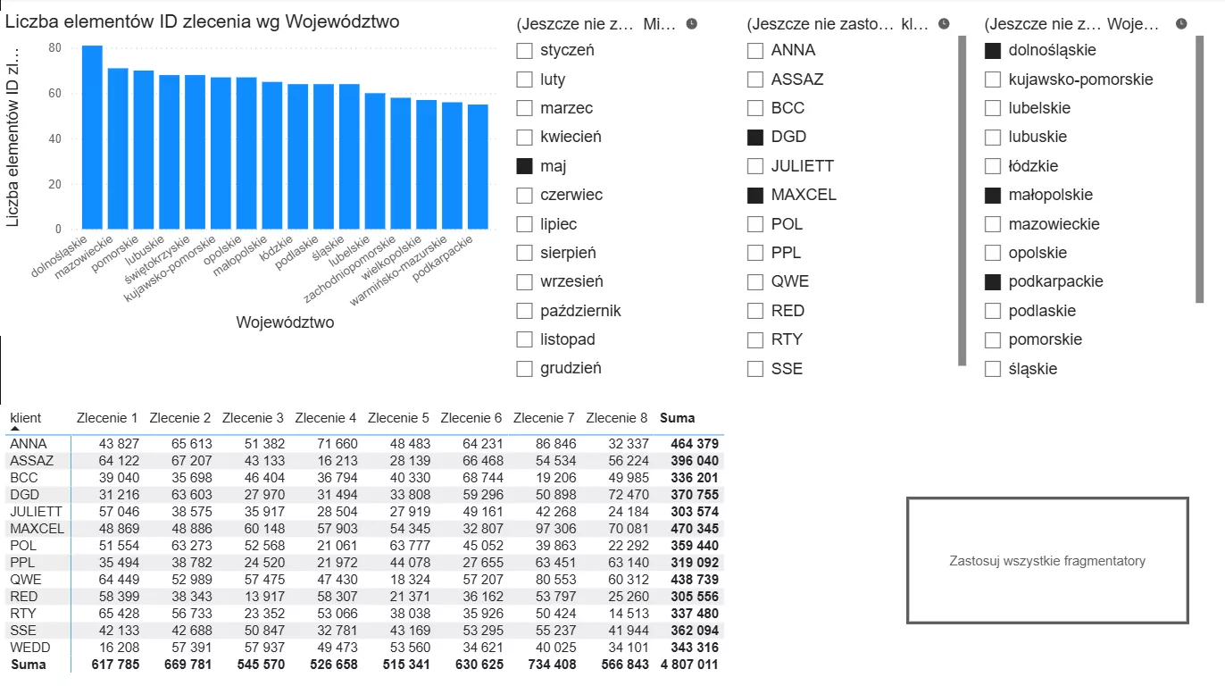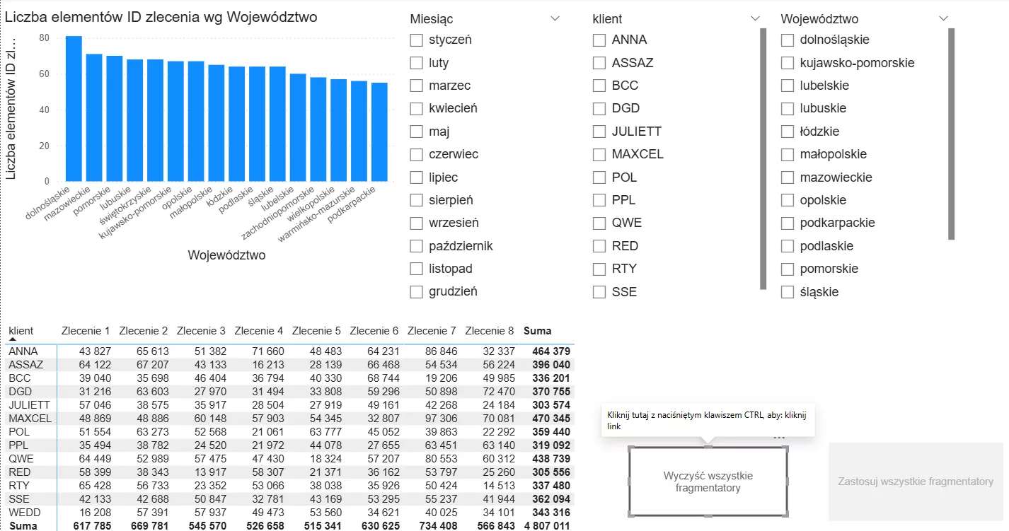 Do raportu dodamy również trzy fragmentatory: województwo, miesiąc i nazwę klienta: