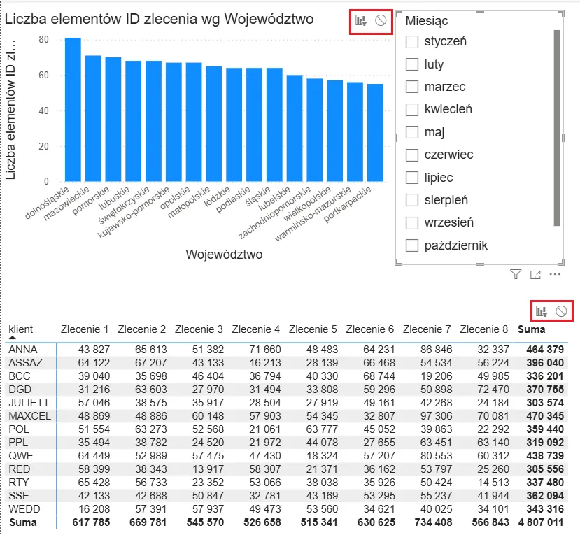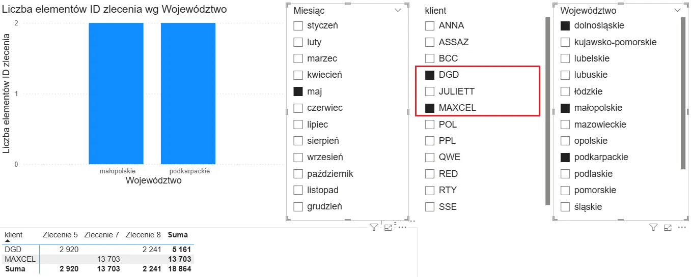 Zauważ, że przy każdym dokonanym wyborze we fragmentatorach, np. wybór miesiąca, czy województwa, „wyklikanie” wielu klientów, nasze wizualizacje odświeżają się za każdą zaznaczoną pozycją: