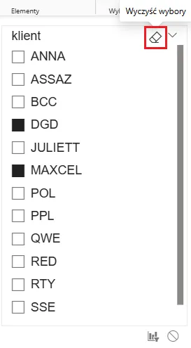 Jeśli mamy uruchomić kilka filtrów, to aby uniknąć odświeżania całych stron z wizualizacjami przy każdym pojedynczym kliknięciu (filtrowaniu) we fragmentatorze, zadbajmy o to, aby wszystkie filtry włączać/wyłączać jednym kliknięciem.