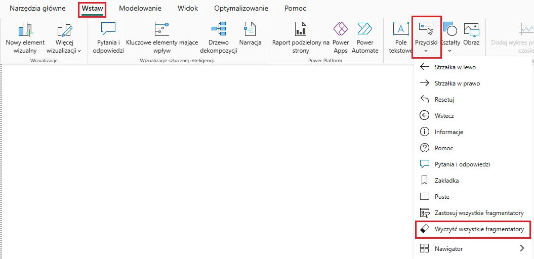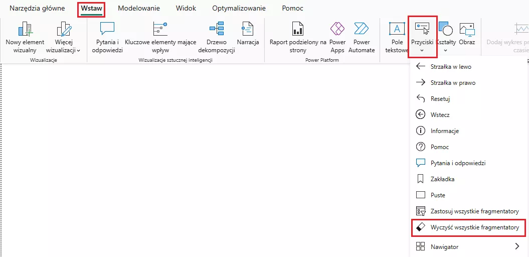 Aby aktywować opcję Wyczyść wszystkie fragmentatory, wybieramy Wstaw – Przyciski – Wyczyść wszystkie fragmentatory: