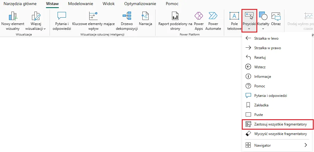 Opcja Zastosuj wszystkie fragmentatory pozwala nam jednym kliknięciem aktywować wszystkie filtry z fragmentatorów w raporcie, zamiast aktywować każdy po kolei. Skorzystanie z tej opcji zdecydowanie zwiększy wydajność naszego raportu – pozwoli nam to uniknąć niepotrzebnego odświeżania danych.