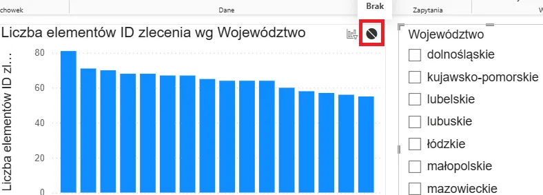 Chcemy, aby fragmentator z województwami nie wpływał na wykres, ponieważ zależy nam na wyświetlaniu danych dla wszystkich województw – filtr z tego fragmentatora na wykres powoduje, że wyświetla się tylko jeden słupek: