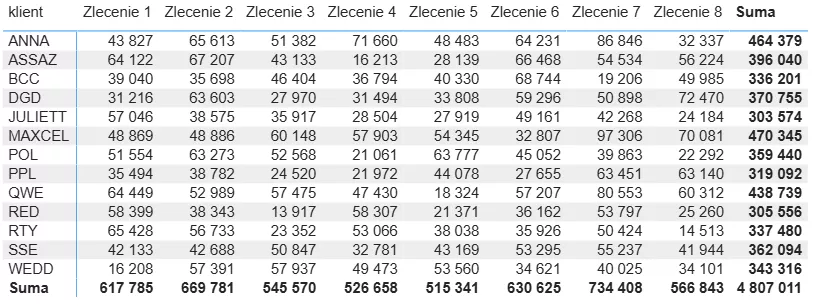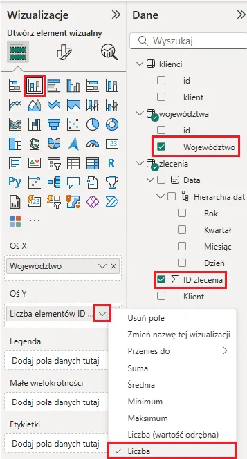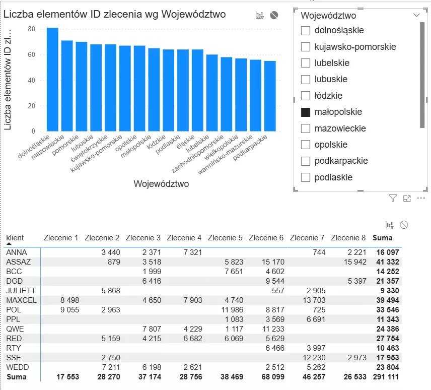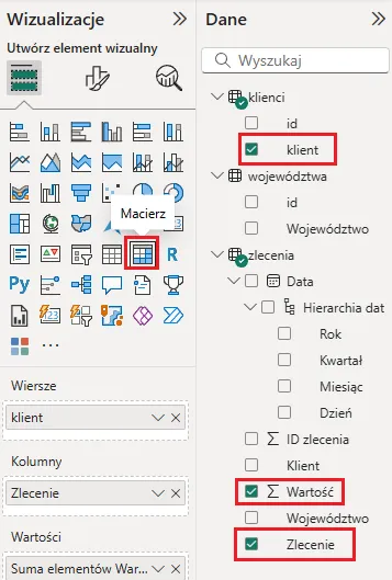 Stworzymy raport, w którym umieścimy dwie wizualizacje: macierz, która przedstawi sumaryczną wartość poszczególnych zleceń dla każdego klienta oraz wykres kolumnowy, który przedstawi, ile zleceń zostało wykonanych w każdym województwie.