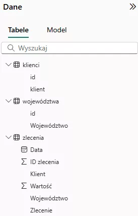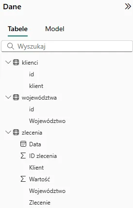 Mamy przykładowe dane załadowane do modelu Power BI: