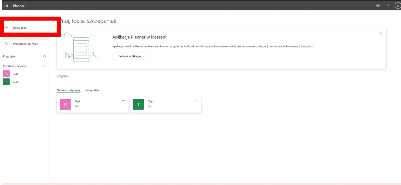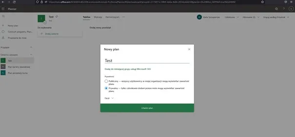 Pierwszym krokiem, który należy zrobić po uruchomieniu jest utworzenie NOWEGO PLANU, który znajduje się w lewym górnym rogu. Na tym etapie należy odpowiednio zatytułować projekt oraz ustalić czy plan będzie dostępny dla wszystkich osób z organizacji, czy tylko wybrana grupa będzie miała do niego dostęp.