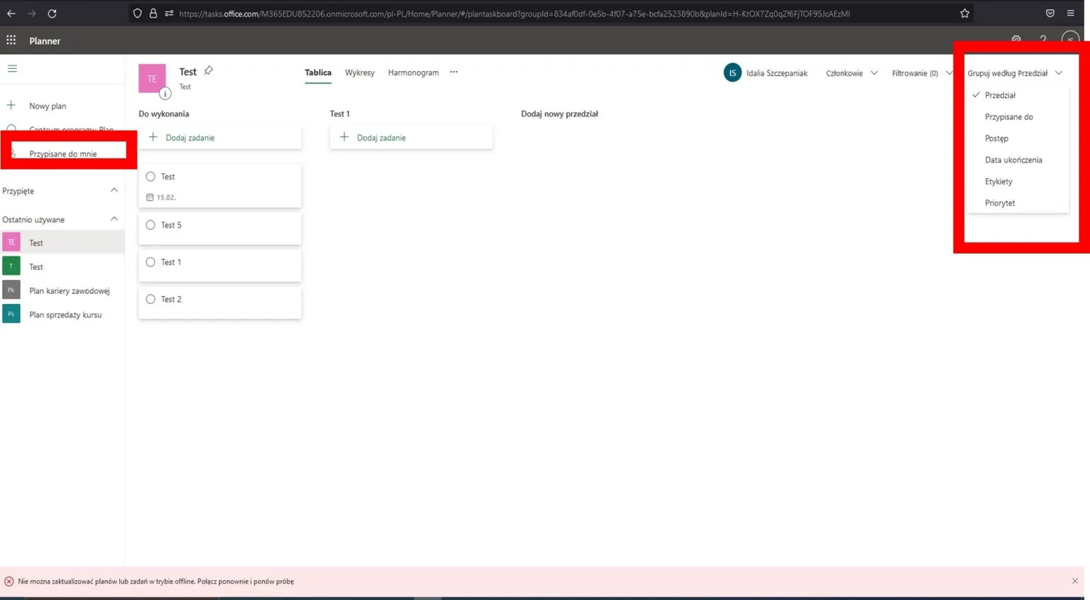 Dodatkowo, konkretne zadania możemy przypisać do konkretnego podrozdziału, którego nazwa również jest edytowalna. W samej aplikacji Planner konkretna osoba może wydzielić obowiązki, które zostały do niej przypisane klikając w lewej kolumnie PRZYPISANE DO MNIE. W widoku głównym, w prawym górnym rogu znajduję się również możliwość grupowania zadań np. według daty ukończenia lub postępu wykonywania.