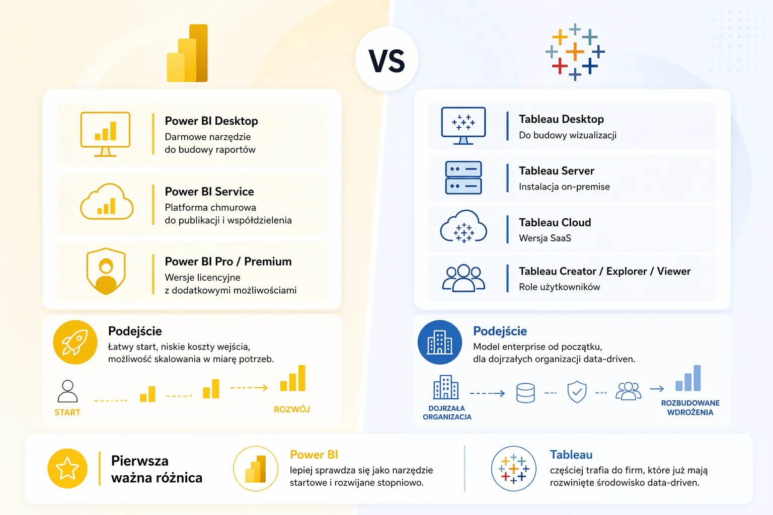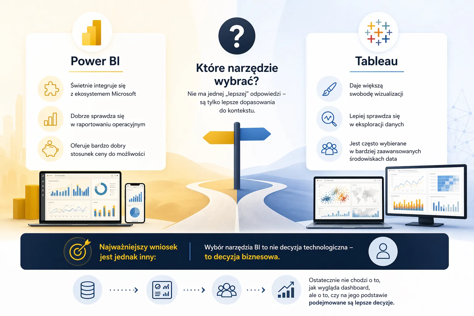 Power BI lepiej sprawdza się jako narzędzie startowe i rozwijane stopniowo, Tableau częściej trafia do firm, które już mają rozwinięte środowisko data-driven.