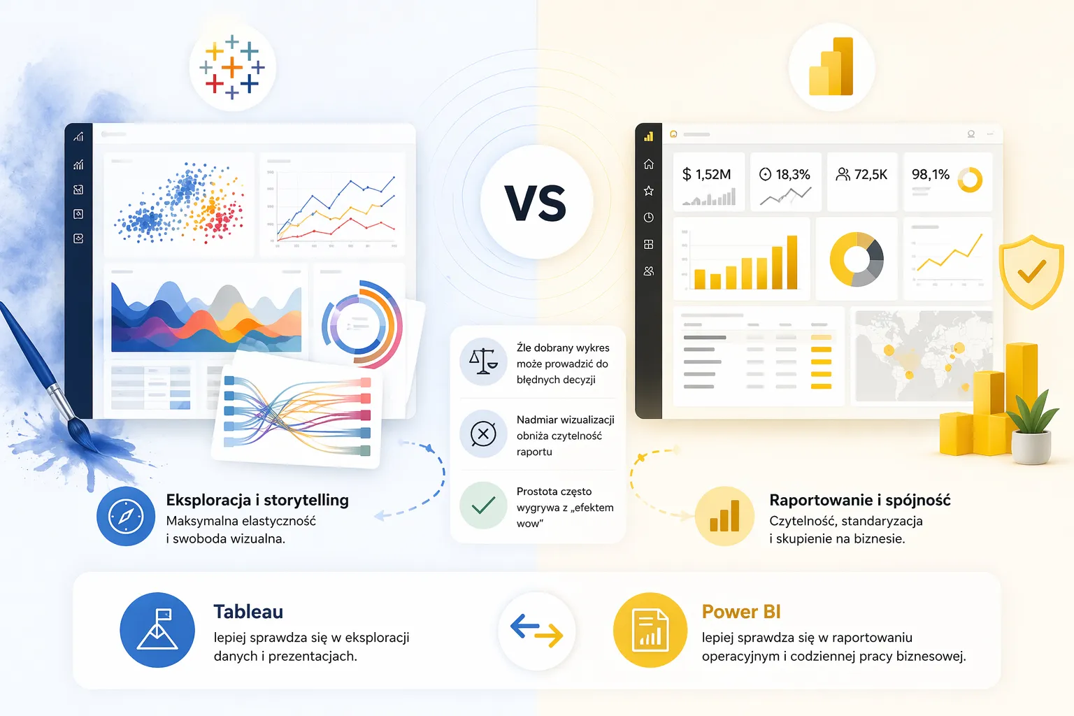 Tableau lepiej sprawdza się w eksploracji danych i prezentacjach, Power BI – w raportowaniu operacyjnym i codziennej pracy biznesowej.