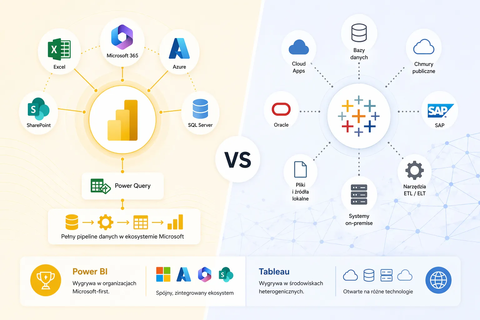 Power BI wygrywa w organizacjach Microsoft-first, Tableau – w środowiskach heterogenicznych.