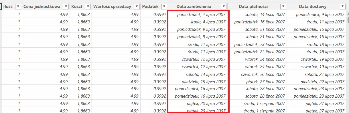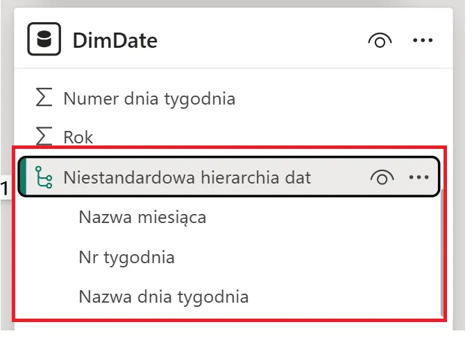 Proszę zwrócić uwagę, że za pomocą funkcji DAX możemy utworzyć dodatkowe kolumny wyliczające tygodnie czy dni tygodnia. Kolumny takie mogą być przydatne do utworzenia niestandardowych hierarchii i zarządzania nimi na raporcie.
