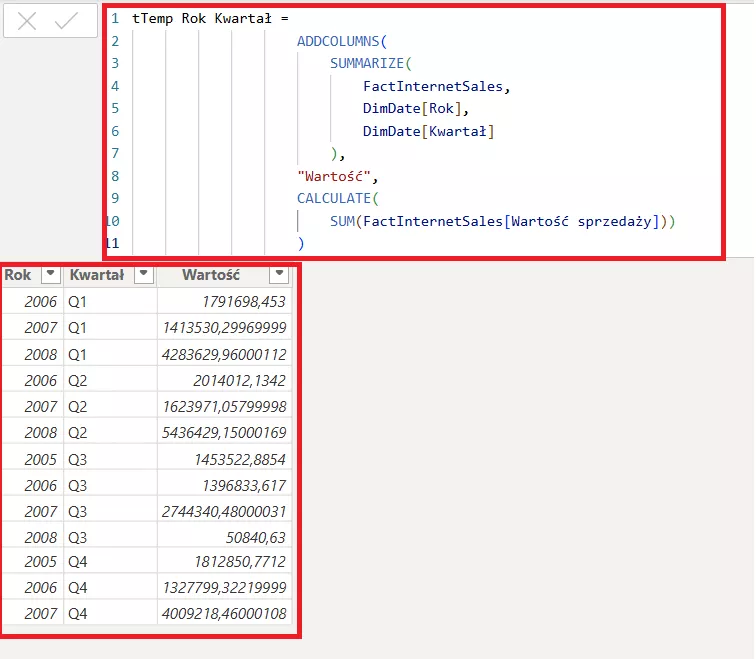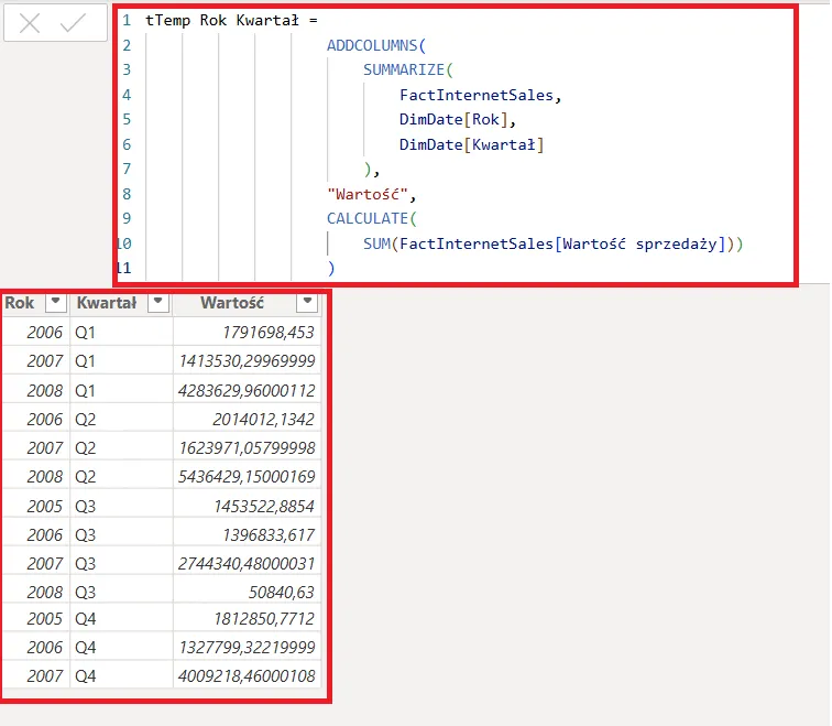 Poniżej wykorzystanie funkcji SUMMARIZE do pogrupowania danych do poziomu roku i kwartału oraz ADDCOLUMNS w celu dodania nowych kolumn obliczeniowych. W wyniku działania takiego wyrażenia otrzymamy nową tabelę na odpowiednim poziomie ziarnistości, która posłuży nam do dalszych wyliczeń, w miarach w Power BI.