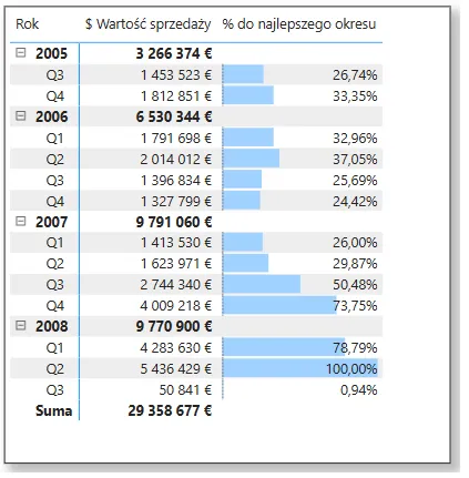 Poniżej tabela prezentująca wyniki sprzedażowego każdego kwartału, oraz porównanie procentowe zawsze do najlepszego okresu sprzedażowego. Efekt taki uzyskałem dzięki agregacji dat za pomocą wyrażeń DAX.