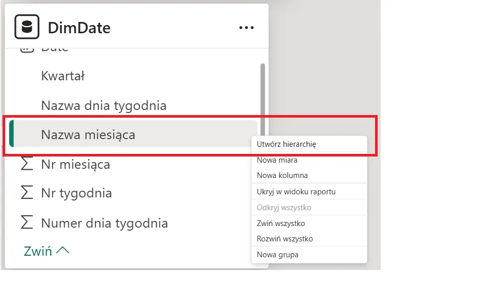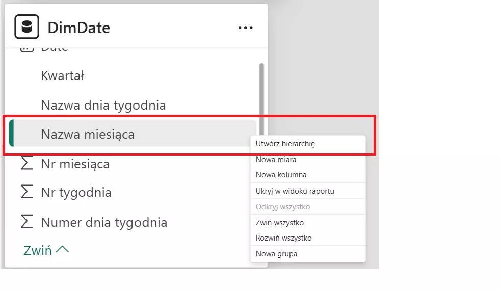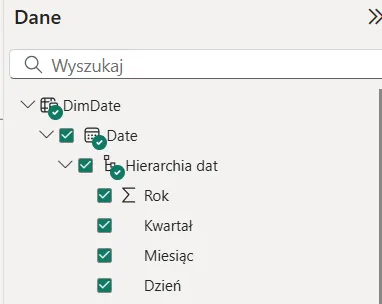 Aby to zrobić, wystarczy w zakładce Widok modelu kliknąć prawym przyciskiem myszy na pole daty, wybrać „Utwórz hierarchię” i dodać poziomy, które Cię interesują.