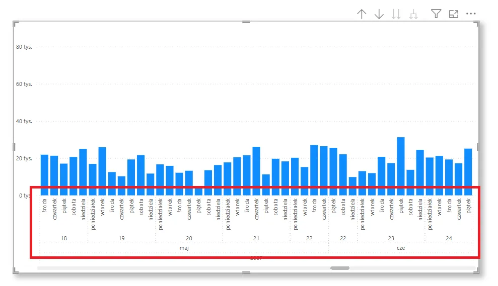 Aby przełączać się między poziomami hierarchii wystarczy wykorzystać strzałeczki, w prawnym górnym rogu wizualizacji służące do wyszczególniania i uogólniania danych.