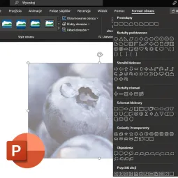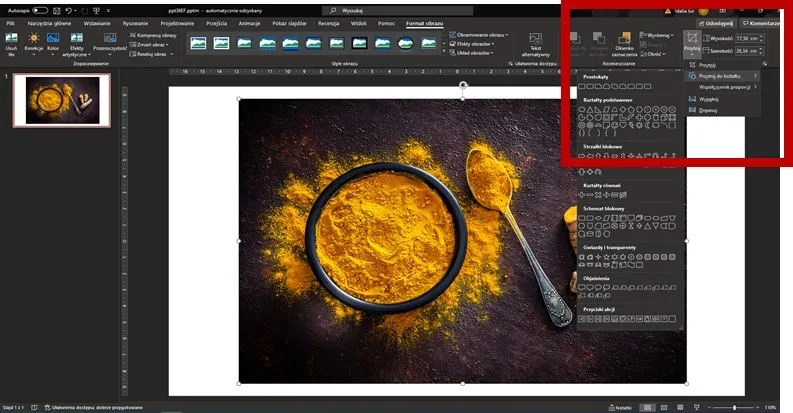 Aby przyciąć zdjęcie do kształtu, należy po wcześniejszym dodaniu obrazu na slajd wejść, w zakładkę FORMAT OBRAZU. Następnie w sekcji ROZMIAR kliknąć PRZYTNIJ i tutaj wybrać dowolny kształt np. kroplę wody. Wokół obrazu pojawią się białe kropki za pomocą, których można zmienić wielkość przyciętego obrazu na slajdzie.