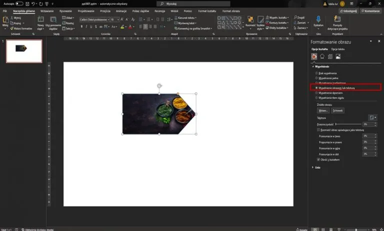 Drugą sposób składa się z tym samych kroków, tylko wykonywanych, w odwrotnej kolejności, czyli najpierw na slajdzie zostaje umieszczony kształt, a dopiero w kolejnym kroku zostaje on wypełniony zdjęciem. Aby tak się zadziało należy kliknąć WSTAWIANIE, a następnie w sekcji ILUSTRACJĘ wstawić dowolny kształt. Następnie przyciskiem myszy kliknąć na kształt i z dostępnych opcji wybrać funkcję FORMATUJ KSZTAŁT. Ostatnim krokiem jest przejście do funkcji WYPEŁNIENIE OBRAZEM LUB TEKSTURĄ i wybranie piku, który ten kształt wypełni.