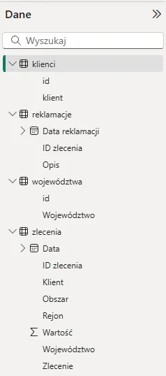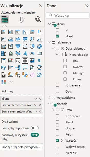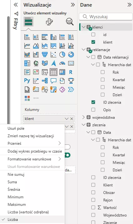 Tworzymy wizualizację tabeli, w której wykorzystamy z tabeli klienci pole klient, z tabeli reklamacje pole ID zlecenia, które następnie zliczymy: