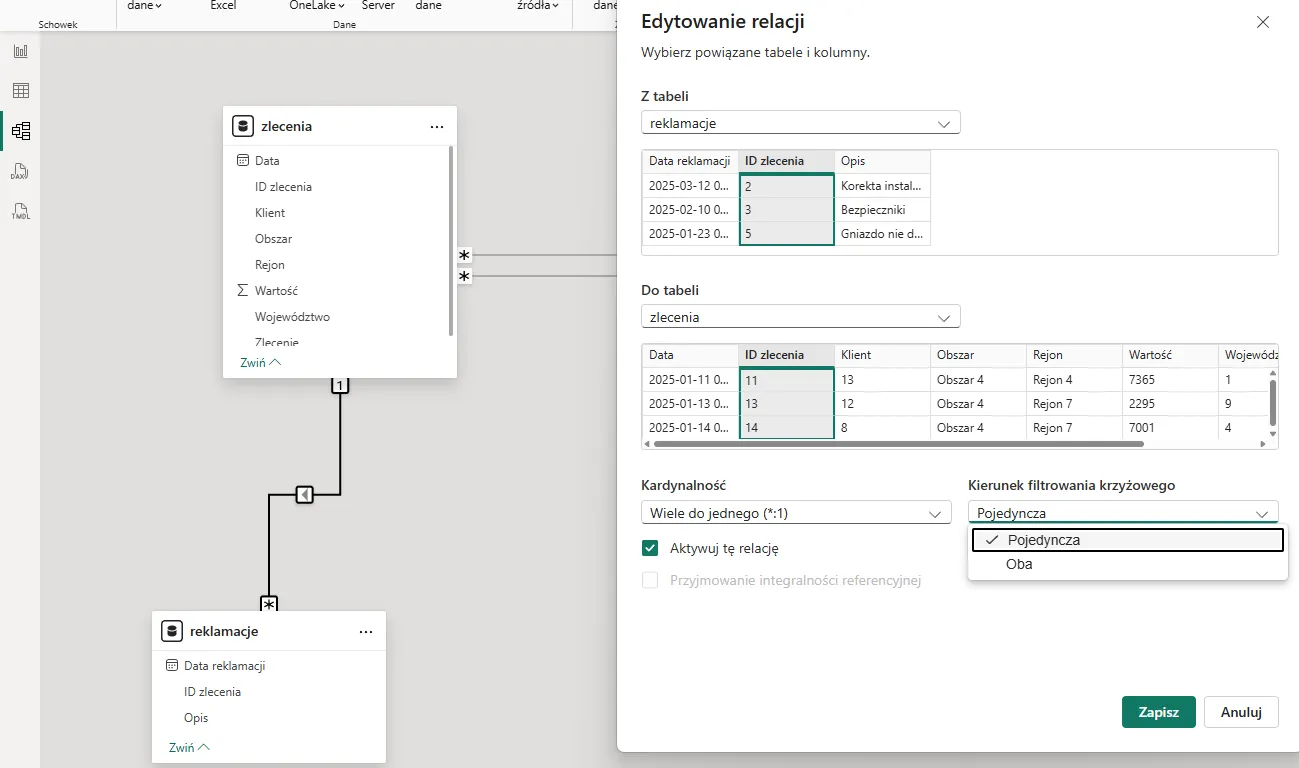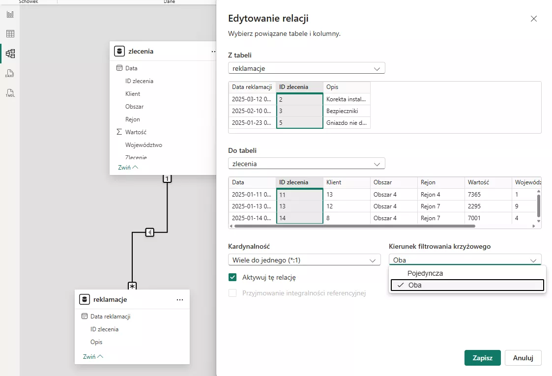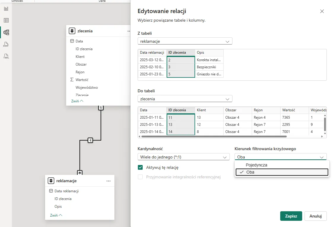 Jak widać, wybór opisu reklamacji nie wpływa już na sumę wartości zleceń. Dzięki funkcji CROSSFILTER() filtr z tabeli reklamacje przepływa dwukierunkowo do tabeli zlecenia, co umożliwia poprawne filtrowanie klientów, mimo że relacja w modelu jest jednokierunkowa.