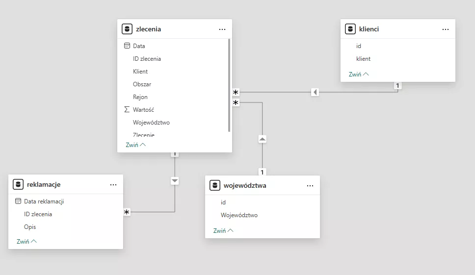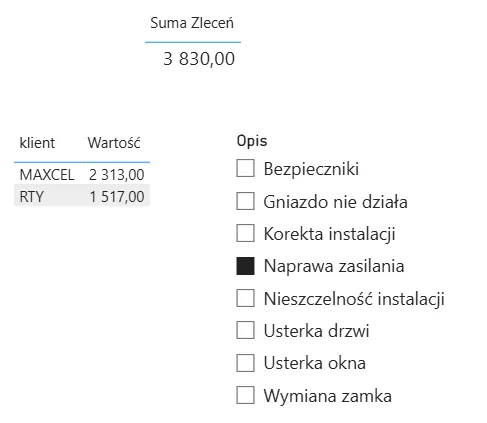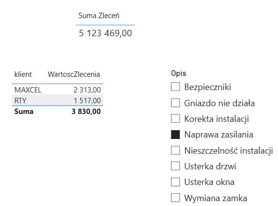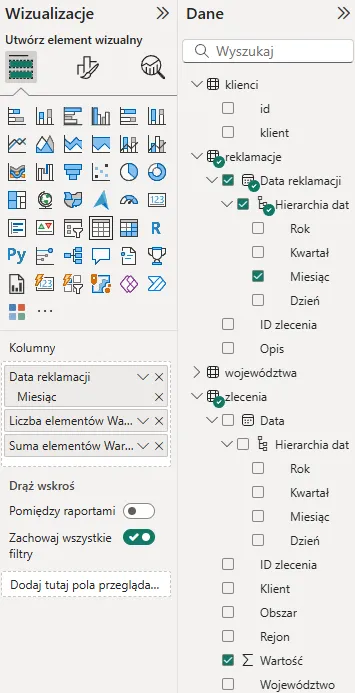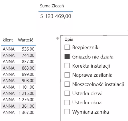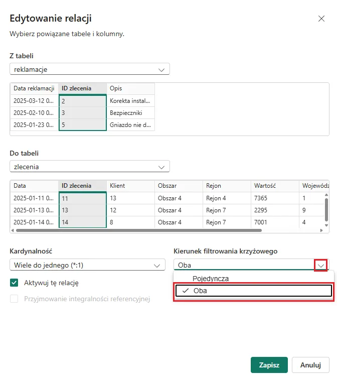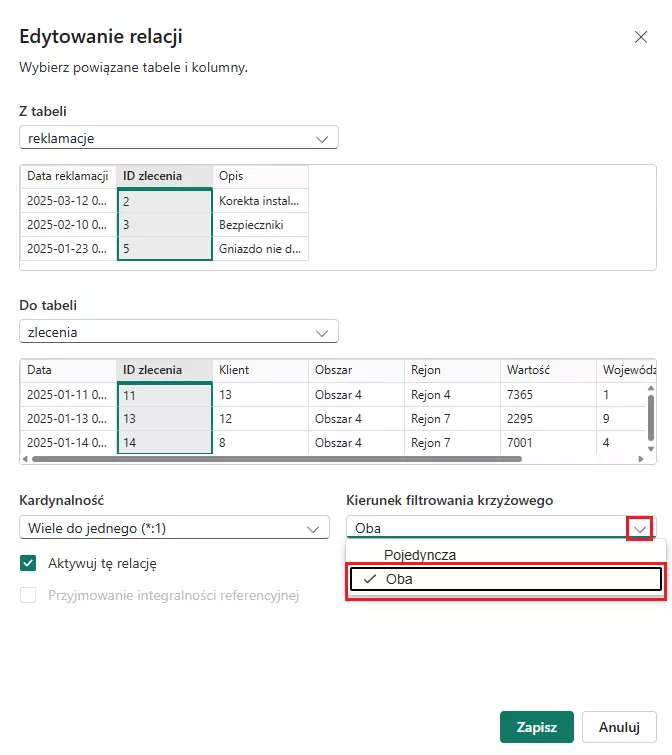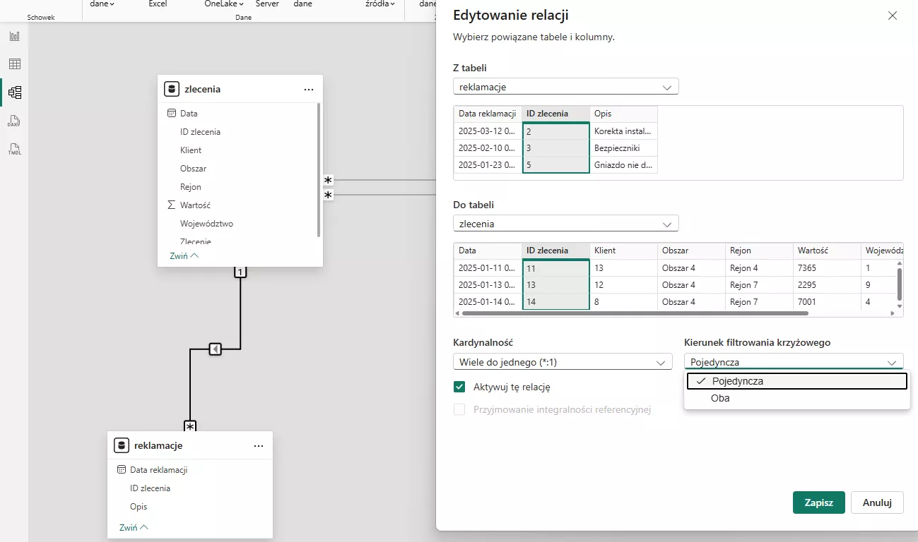 Jak widać, wybór opisu reklamacji nie wpływa już na sumę wartości zleceń. Dzięki funkcji CROSSFILTER() filtr z tabeli reklamacje przepływa dwukierunkowo do tabeli zlecenia, co umożliwia poprawne filtrowanie klientów, mimo że relacja w modelu jest jednokierunkowa.