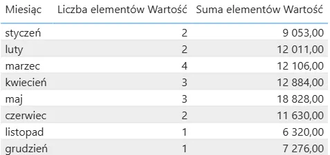 Trzecia wizualizacja będzie przedstawiać, w ujęciu miesięcznym, liczbę zleceń oraz ich wartość, ale tylko w tych miesiącach, w których wystąpiły reklamacje.