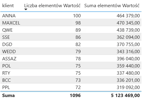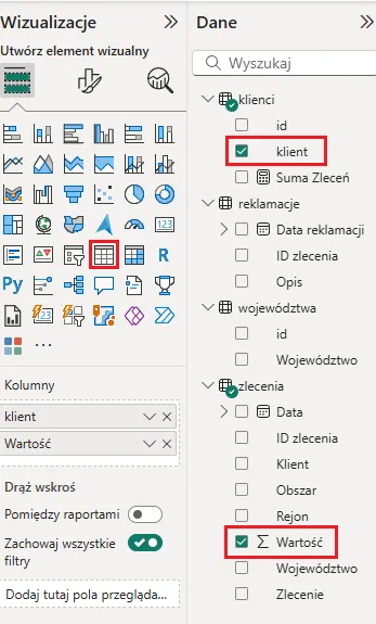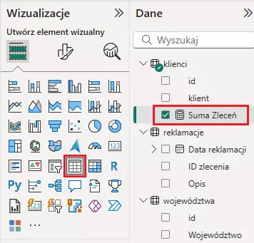 Tworzymy wizualizację tabeli, w której wykorzystamy z tabeli klienci pole klient, z tabeli zlecenia pole wartość dwukrotnie, jedno pole będzie sumą zleceń, a drugie liczbą zleceń:
