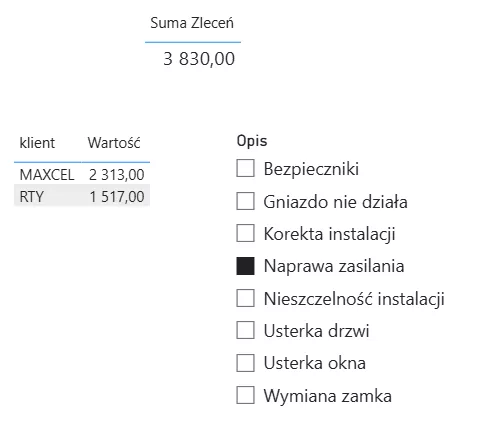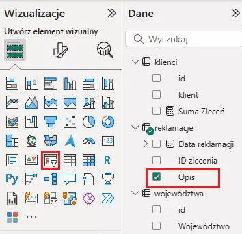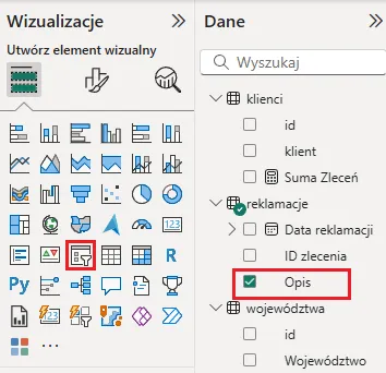 W tym przykładzie chcemy stworzyć dwie wizualizację. Pierwsza z nich ma nam pokazać łączną wartość wszystkich zleceń. Druga natomiast, po wybraniu konkretnego opisu reklamacji we fragmentatorze, wyświetli nam, którzy klienci złożyli reklamacje o danym opisie oraz wartość zlecenia, na które ta reklamacja została złożona.