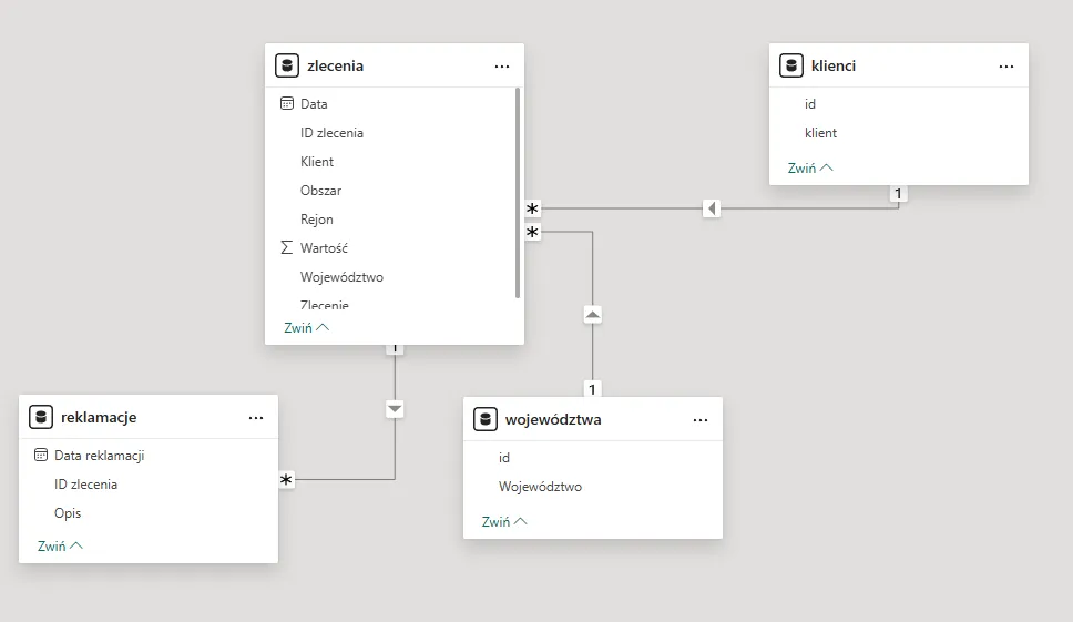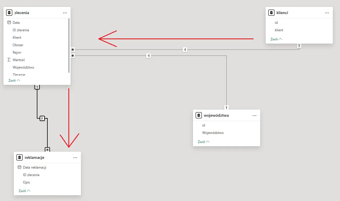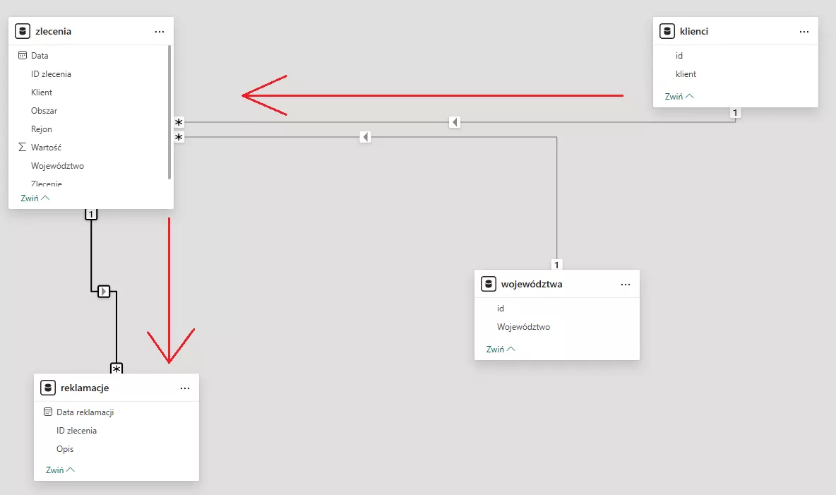 Tabela wymiaru klienci „ma wpływ” (filtruje) na dane w tabeli faktów zlecenia, a tabela zlecenia „ma wpływ” na tabelę reklamacje: