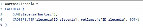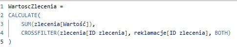 Po zmianie relacji na dwukierunkową, druga wizualizacja działa już poprawnie. Jednak jednocześnie suma wartości wszystkich zleceń w pierwszej wizualizacji przestała działać prawidłowo – sumuje nam dane w niepożądany sposób. Dzieje się tak, ponieważ relacja dwukierunkowa spowodowała, że filtr na reklamacjach, który miał dotyczyć wizualizacji drugiej, wpływa również na wizualizację pierwszą. W takich sytuacjach ustawienie relacji dwukierunkowej na stałe może prowadzić do błędów i utrudniać nam tworzenie raportów. Tu z pomocą przychodzi funkcja CROSSFILTER(), która pozwoli nam na zmianę kierunku filtrowania tylko w jednej z wizualizacji, opartej o miarę, wykorzystującą funkcję CROSSFILTER(). Dzięki temu model relacyjny się nie zmieni, globalny kierunek filtrowania pozostanie także niezmienny, a my unikniemy niepożądanych efektów ubocznych.