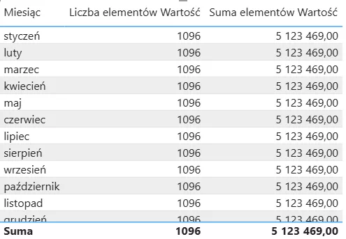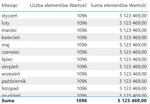 Jak możemy zauważyć, raport nie wyświetla nam danych poprawnie – przedstawia wszystkie 12 miesięcy, a w każdym z nich wyświetla tę samą wartość, która jest liczbą wszystkich zleceń ogólnie. Dzieje się tak, ponieważ relacja jednokierunkowa nie uwzględnia wzajemnego wpływu między tabelami zlecenia i reklamacje. Aby rozwiązać ten problem, zmienimy typ relacji na dwukierunkowy.