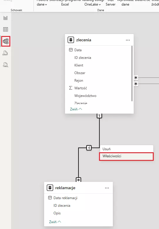 Aby to zrobić, przechodzimy do widoku modelu, następnie klikamy prawym przyciskiem myszy na relację, wybieramy Właściwości, a następnie zmieniamy kierunek filtrowania na „Oba”: