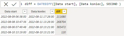 Rozwiązanie niestety już takie banalne nie jest. Istnieje co prawda bardzo fajna funkcja w DAX DATEDIFF, która pozwala policzyć np. liczbę minut czy też sekund między dwoma czasami (datami), jednak ma ona w naszym wydaniu zasadniczą wadę. Przyjrzyjmy się działaniu tejże funkcji na takim zestawie: