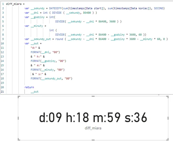 Pamiętaj, że ta funkcja jest zbudowana w kolumnie obliczeniowej w DAX. Takiej kolumny nie jesteś w stanie zsumować na raporcie (jest tekstem). Jeśli chciałbyś skorzystać z analogicznego obliczenia na poziomie miary – musisz w jakiś sposób przekazać informacje o czasach do miary. Jednym z rozwiązań może być utworzenie np. takiej miary: