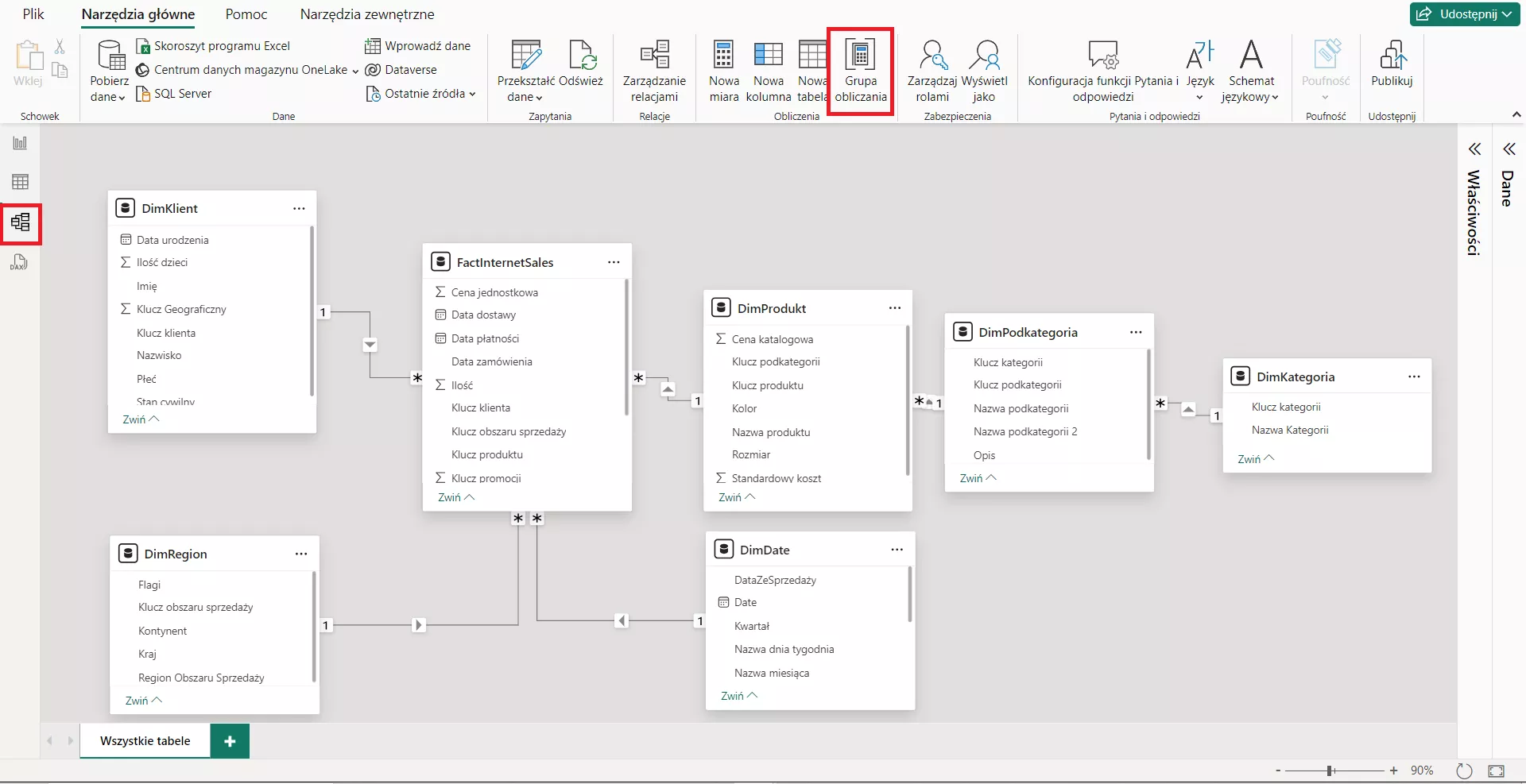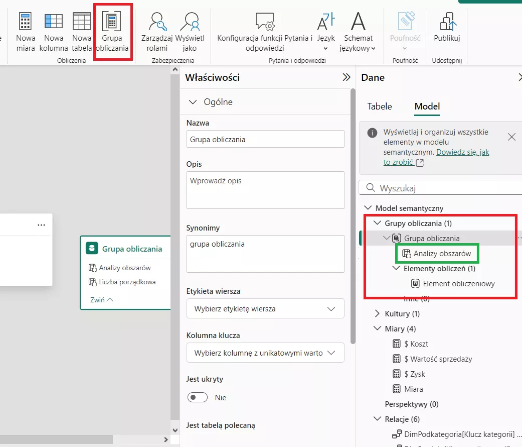 Kolejnym etapem naszej przygody z grupami będzie utworzenie właśnie grupy obliczanej więc przechodząc na widok modelu wybieramy opcję Grupa obliczana (zmieniam jej nazwę np. na Analizy obszarów) – taka nazwa będzie też widoczna na raporcie. Zwróćcie uwagę, że w grupie pojawił się także element obliczeniowy. Na tym etapie można powiedzieć, że to taka trochę miara, którą definiujemy w tym miejscu, a później wykorzystamy ją elastycznie na raporcie.