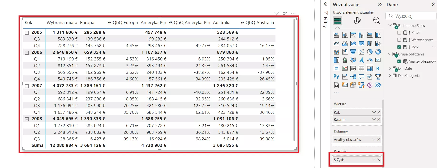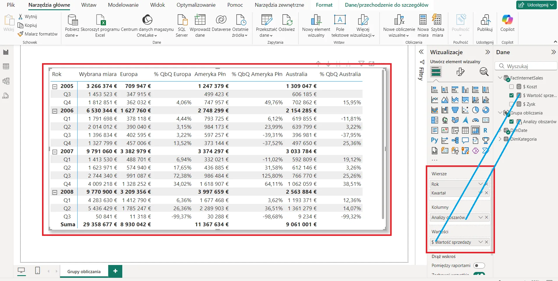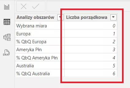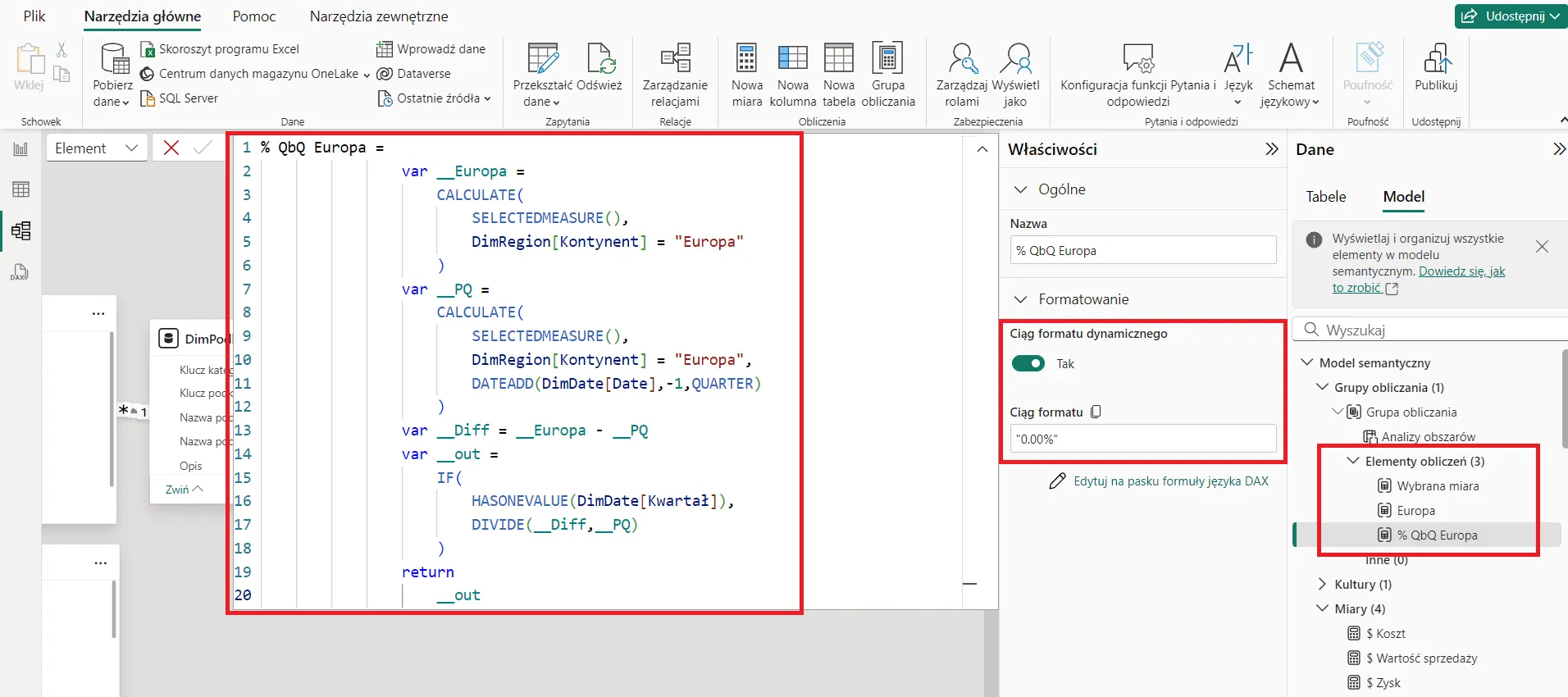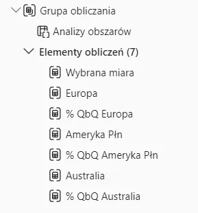 Następnie w podobny sposób używając języka DAX oraz zmiennych utworze kolejne elementy obliczeniowe w grupie o nazwie Analizy obszarów gdzie wyliczę wartości dla każdego kontynentu oraz analizę porównawczą QbQ %. Nieocenionym atutem na tym etapie będzie dobra znajomość języka DAX aby w prawidłowy sposób napisać kod, który później posłuży nam do analiz i wizualizacji.