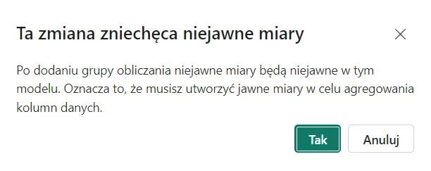 Pierwszą ważna informacją, o której nie można zapomnieć jest fakt, że funkcjonalność ta pracuje tylko na miarach jawnych czyli nie można skorzystać np. z kolumn obliczeniowych w modelu. Po kliknięciu w tworzenie grupy dostajemy taki komunikat informujący nas o tym.