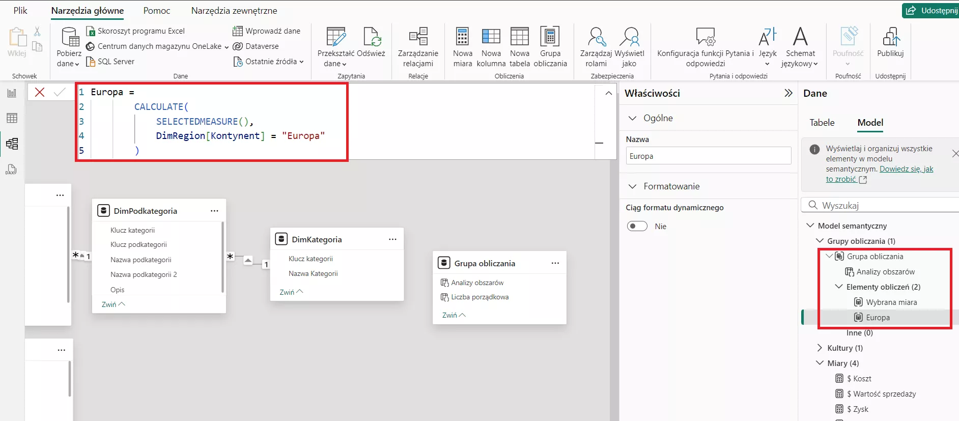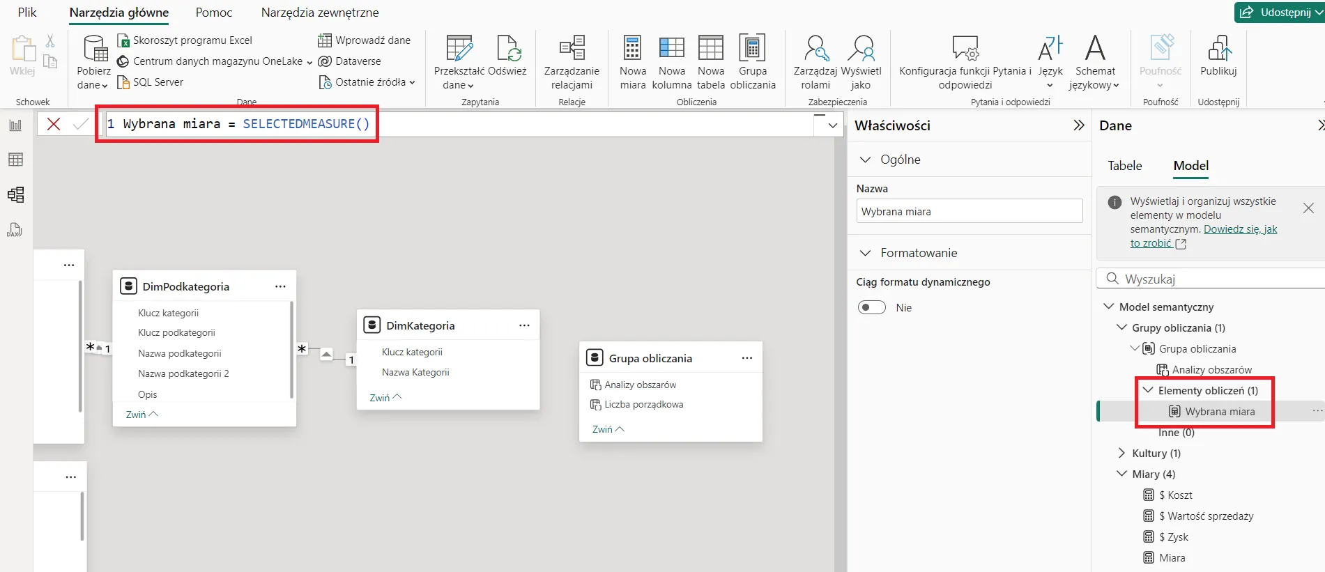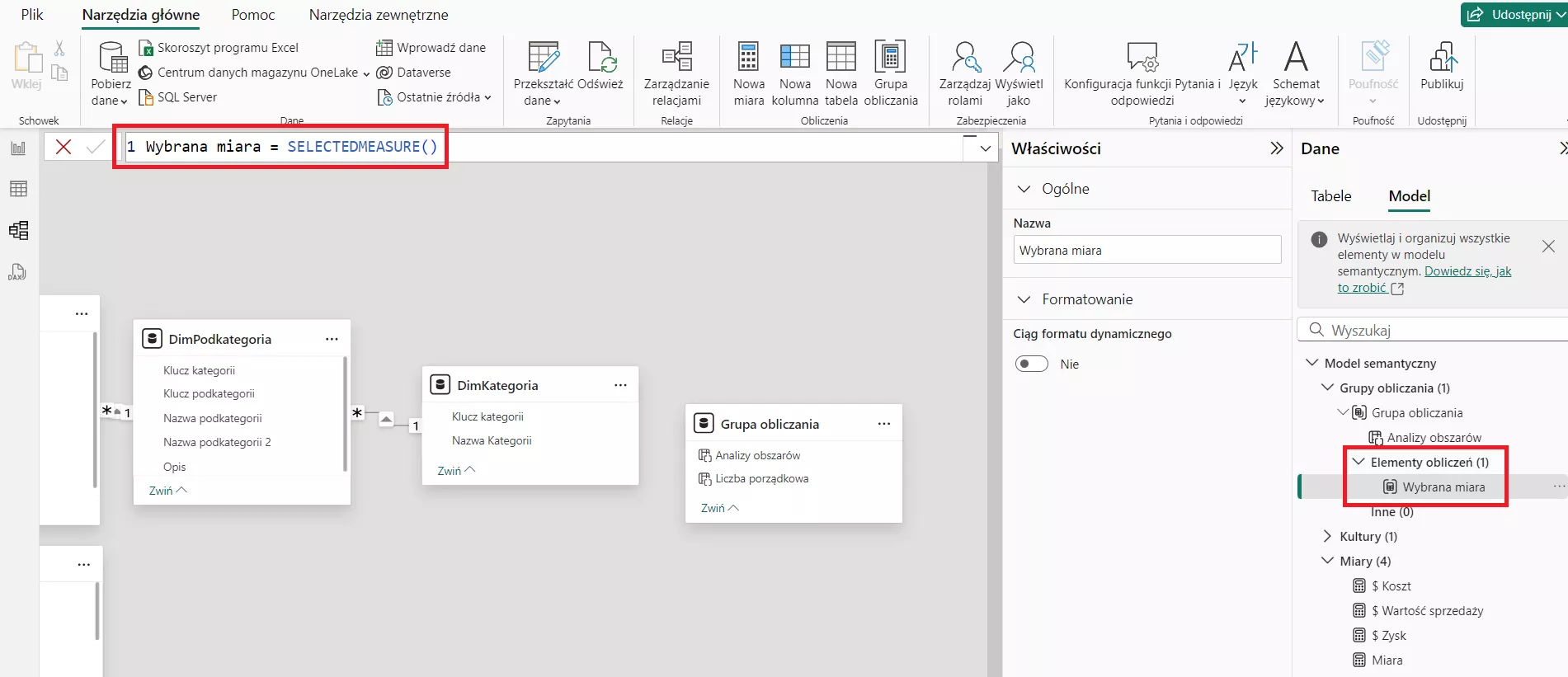 Dzięki funkcji SELECTEDMEASURE() można uprościć model danych, unikając potrzeby definiowania wielu podobnych miar. Zamiast tego można użyć jednej uniwersalnej logiki w grupach obliczanych. Użyje funkcji aby utworzyć nowe elementy obliczeniowe, w grupie o nazwie Analizy obszarów. Zaznaczyłem element obliczeniowy i wykorzystałem wspomniana funkcję w celu utworzenia pierwszego elementu obliczeniowego. Dla uproszczenia nazwałem go Wybrana miara jak poniżej: