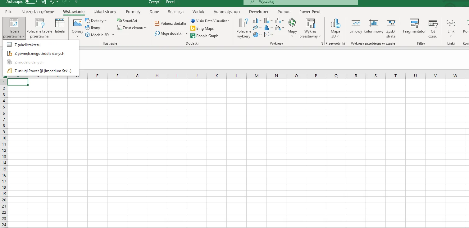 Bardzo często tabele przestawne otwierane są w nowym arkuszu, ale można to zmienić zaznaczając konkretną komórkę i wybierając opcje ISTNIEJĄCY ARKUSZ w okienku, które pojawia się po przejściu do tabeli przestawnych.