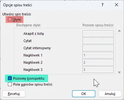 W oknie definiowania parametrów spisu treści odznaczamy sekcję zaznaczoną powyżej na czerwono czyli Style i zaznaczamy opcję Poziomy konspektu. Po zatwierdzeniu przyciskiem OK otrzymamy spis treści oparty o naszą strukturę poziomów konspektu.