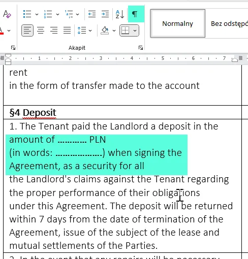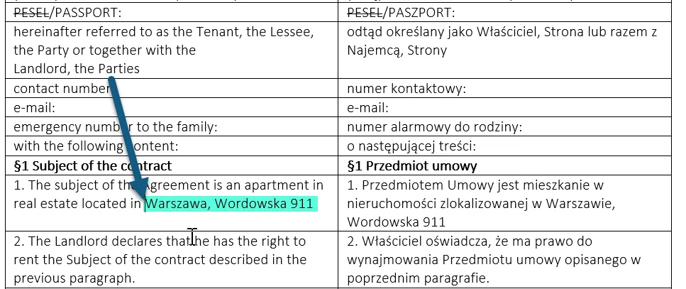 Wystarczy ustawić się w miejscu, gdzie chcemy taki niewidzialny znacznik postawić i zaznaczyć tekst nim objęty. W moim przypadku do oznaczenia przedmiotu najmu – przed adresem: