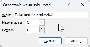 W oknie dialogowym wyświetlonym przez MS Word należy określić wpis spisu treści, np.: