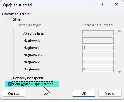 W opcjach wstawiania niestandardowego spisu treści wybieramy wyłącznie opcję mówiącą o pobraniu do spisu treści niestandardowych znaczników zgodnie z poniższym zrzutem: