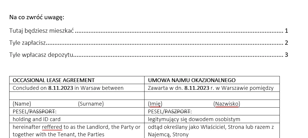 Wyobraź sobie, że tworzysz jakąś umowę. Weźmy na tapetę przyziemny temat – wynajem mieszkania. Twoja umowa ma 9 stron, chciałbyś ją wysłać do przejrzenia drugiej stronie umowy. W umowie jest bardzo dużo elementów istotnych i tych, które należy przeczytać ale nie są kluczowe. Dlatego chciałbyś na początku umowy wstawić spis treści, który pozwoli użytkownikowi przenieść się do najważniejszych sekcji, czyli: