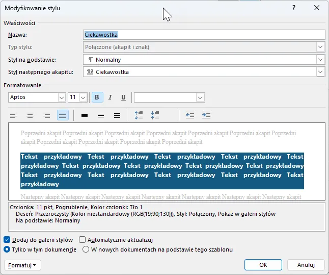 Załóżmy, że masz już utworzony styl, który odpowiada za wyświetlenie tytułu ciekawostki w dokumencie MS Word: