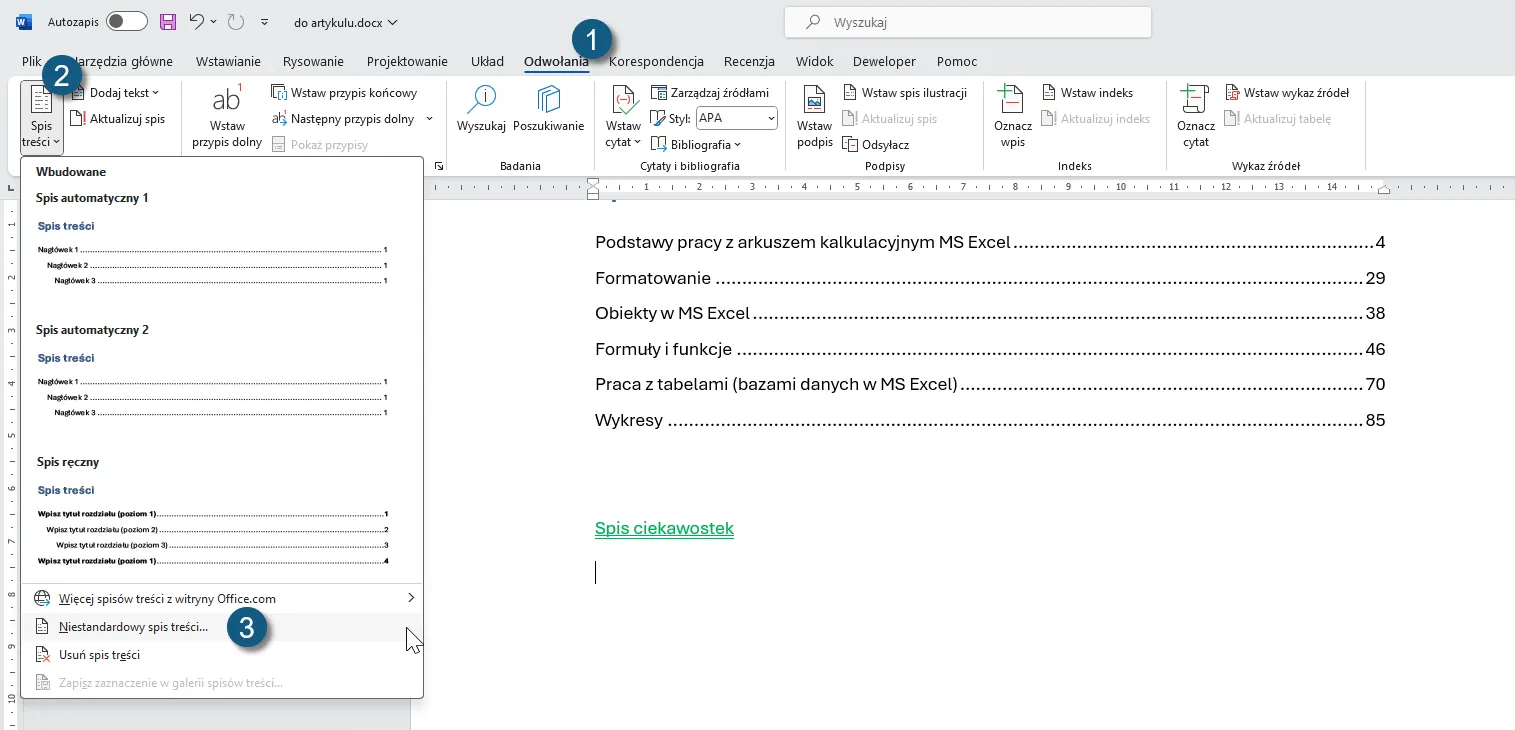 Przejdźmy następnie do wstawiania spisu treści (zgodnie z poniższym zrzutem):