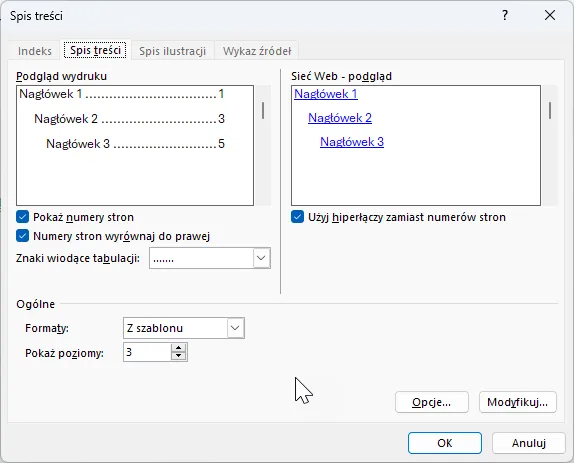 Microsoft Word wyświetli nam standardowe okno (o zgrozo, przy niestandardowym spisie) wstawiania spisu treści: