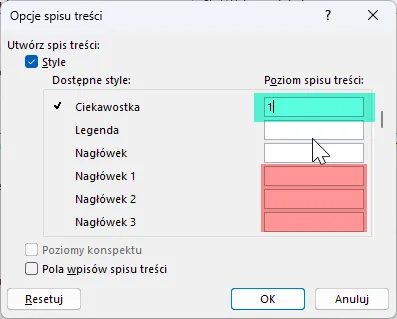 Przejdźmy zatem do polecenia Opcje w sekcji Spis treści i w zaznaczonych na czerwono poniżej polach usuńmy domyślne poziomy spisu treści, po czym przy zaznaczonym na zielono polu wskażmy, że interesuje nas potraktowanie ciekawostek jako pierwszego (i de facto jedynego) poziomu do spisu treści.