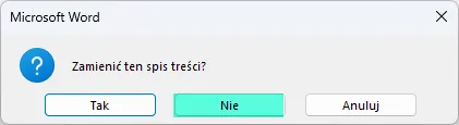 „Drogi użytkowniku, widzę, że masz już spis treści w dokumencie. Czy Ty chcesz może żebym ja, potężny władca dokumentu MS Word zastąpił dotychczasowy spis treści? Kliknij tylko tak, a to wykonam.”