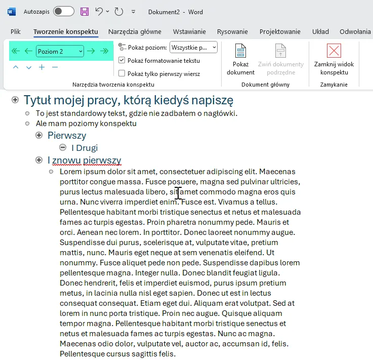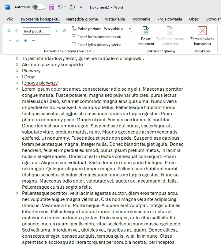 Praca z konspektem jest dość osobliwym sposobem na pracę z edytorem MS Word, zwłaszcza w dobie wszelkich usprawnień, które niosą nam nowoczesne funkcje AI dostępne w pakiecie Microsoft 365. Niemniej jednak istnieje grupa osób, które wciąż z tego typu funkcjonalności lubią korzystać, żeby uzyskać pełniejszy ogląd na strukturę dokumentu. W widoku konspektu łatwo zauważyć jak dokument podzielony jest na akapity. Przykładowo widok konspektu dla dokumentu może wyglądać jak na poniższym zrzucie:
