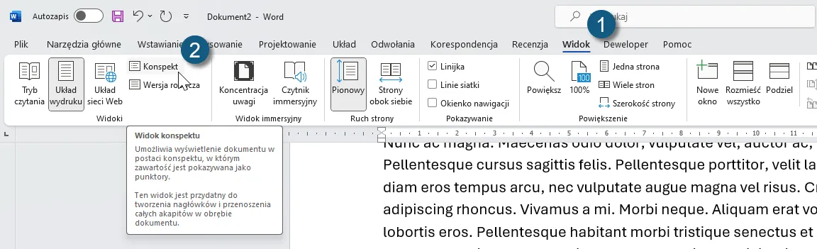 Taki widok można oczywiście w MS Word włączyć korzystając z przycisku Konspekt znajdującego się na karcie Widok.